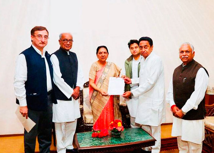Jyotiraditya Scindia, Digvijay Singh and Vivek Tankha were the other Congress leaders who accompanied Kamal Nath to meet the governor. The Congress party won 114 seats, received support from BSP, with 2, 1 from SP & 4 seats from independent candidates. The total tally of Congress and its allies is 121 seats.